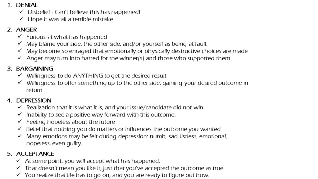 - Let them grieve. Their reasons for supporting the candidates and issues they supported make total sense to them, just like your reasons make total sense to you. Their world just crumbled. They will have thoughts and feelings about the election, about the loss, about the future. They may be in disbelief, they may deny the outcome, they may be spitting nails angry, they may feel utterly hopeless. It’s been intense for all of us. They will need time to process those feelings. Be understanding about that.